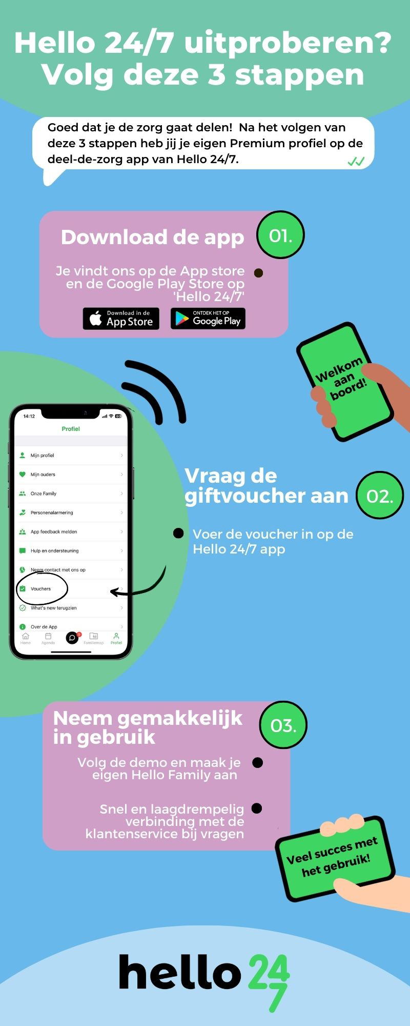 Zorg je voor iemand die niet alles zelf kan? Even of langdurig? Doe het niet alleen. Deel de zorg met Hello 24/7. Dé app waarmee je snel extra helpende handjes organiseert en de zorg voor een ander makkelijk samen regelt. Zodat jij er niet meer alleen voor staat.