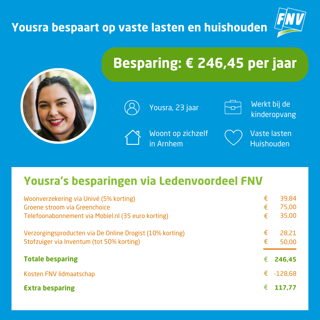 - Het voordeel is beschikbaar voor FNV-leden. Als je lidmaatschap eindigt, eindigt ook je toegang tot dit voordeel. Er kan een check op actief lidmaatschap worden uitgevoerd.